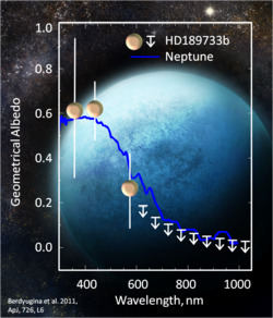 In 2008, a team of astrophysicists appeared to have detected and monitored the planet's visible light using polarimetry, which would have been the first such success.[10] This result seemed to be confirmed and refined by the same team in 2011.[5] They found that the planet albedo is significantly larger in blue light than in the red, most probably due to Rayleigh scattering and molecular absorption in the red.[5] The blue color of the planet was subsequently confirmed in 2013,[11] which would have made HD 189733 the first planet to have its overall color determined by two different techniques. These measurements in polarized light have since been disputed by two separate teams using more sensitive polarimeters,[12][13][14] with upper limits of the polarimetric signal provided therein.