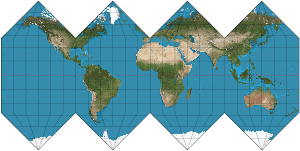 The spherical projection combines a cylindrical equal area projection, the Lambert cylindrical equal-area projection, for the equatorial regions of the sphere and a pseudocylindrical equal area projection, an interrupted Collignon projection, for the polar regions.[1][9]