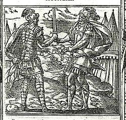 As described by Homer in the Iliad[6] at the advice of Hector’s brother Helenus (who also was divinely inspired) and being told by him that he was not destined to die yet, Hector managed to get both armies seated and challenged any one of the Greek warriors to single combat. The Argives were initially reluctant to accept the challenge. However, after Nestor's chiding, nine Greek heroes stepped up to the challenge and drew by lot to see who was to face Hector. Ajax won and fought Hector. Hector was unable to pierce Ajax's famous shield, but Ajax crushed Hector's shield with a rock and stabbed through his armor with a spear, drawing blood, upon which the god Apollo intervened and the duel was ended as the sun was setting. Hector gave Ajax his sword, which Ajax later used to kill himself. Ajax gave Hector his girdle that Achilles later attached to his chariot to drag Hector's corpse around the walls of Troy.