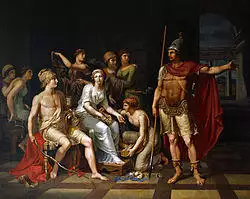 The Greeks attack and drive the Trojans back. Hector must now go out to lead a counter-attack. According to Homer[10] his wife Andromache, carrying in her arms her son Astyanax, intercepts Hector at the gate, pleading with him not to go out for her sake as well as his son's. Hector knows that Troy and the house of Priam are doomed to fall and that the gloomy fate of his wife and infant son will be to die or go into slavery in a foreign land. With understanding, compassion, and tenderness he explains that he cannot personally refuse to fight, and comforts her with the idea that no one can take him until it is his time to go. The gleaming bronze helmet frightens Astyanax and makes him cry.[11] Hector takes it off, embraces his wife and son, and for his sake prays aloud to Zeus that his son might be chief after him, become more glorious in battle than he, to bring home the blood of his enemies, and make his mother proud. Once he left for battle, those in the house began to mourn as they knew he would not return. Hector and Paris pass through the gate and rally the Trojans, raising havoc among the Greeks.