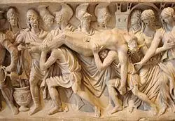 Hector strips the armor of Achilles off the fallen Patroclus and gives it to his men to take back to the city. Glaucus accuses Hector of cowardice for not challenging Ajax. Stung, Hector calls for the armor, puts it on, and uses it to rally the Trojans. Zeus regards the donning of a hero's armor as an act of insolence by a fool about to die, but it makes Hector strong for now.[17]