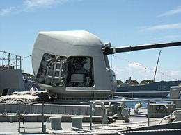 As designed, the main armament for the frigate is a 5-inch 54 calibre Mark 45 gun, supplemented by an eight-cell Mark 41 vertical launch system (for RIM-7 Sea Sparrow or RIM-162 Evolved Sea Sparrow missiles), two 12.7-millimetre (0.50 in) machine guns, and two Mark 32 triple torpedo tube sets (initially firing Mark 46 torpedoes, but later upgraded to use the MU90 Impact torpedo).[3][11][13] They were also designed for but not with a close-in weapons system (two Mini Typhoons fitted when required from 2005 onwards), two quad-canister Harpoon anti-ship missile launchers (which were installed across the RAN vessels from 2005 onwards), and a second Mark 41 launcher (which has not been added).[3][14][15] The Australian Anzacs use a Sikorsky S-70B-2 Seahawk helicopter; plans to replace them with Kaman SH-2G Super Seasprites were cancelled in 2008 due to ongoing problems.[3][16][17]
