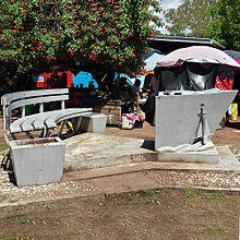 Another memorial is located at the Police Memorial Park in Rove, Honiara, Solomon Islands.[39] The memorial is shaped like the bow of a ship, and points toward Savo Island.[39] A previous memorial to the ship, which had been located in the grounds of the Vilu Military Museum, was destroyed in 2000 during "the Tensions".[39] A memorial plaque is also dedicated to HMAS Canberra and her Tasmanian RAN personnel at the Tasmanian Seafarers' Memorial at Triabunna on the east coast of Tasmania.[40]