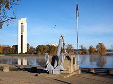 HMAS Canberra is remembered in various places. In her name city of Canberra, a memorial is located next to Lake Burley Griffin,[38] adjacent to the National Carillon. It incorporates a naval anchor and a section of chain cable (of the same type carried by Canberra),[38] and it has two plaques detailing the purpose of the memorial and the details of the cruiser. The memorial was erected by the Australian Capital Territory Branch of the Naval Historical Society, with donations from the ex-HMAS Canberra and Canberra-Shropshire Association members, and was unveiled on 9 August 1981 by Admiral Sir Anthony Synnot.[38] A commemorative address was given at the unveiling by Admiral Sir Victor Smith, who was aboard Canberra at the time of her loss.[38] Each year on the Saturday nearest 9 August, a service is conducted at the memorial, which is attended by the Australian Chief of Navy, the defence attachés from the United States and the United Kingdom, and personnel from the naval base HMAS Harman. A catafalque party was originally provided by personnel from the frigate HMAS Canberra until the ship's 2005 decommissioning; after this, the catafalque party was supplied by the Australian Navy Cadets unit TS Canberra.