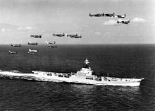 Although commissioned in mid-December 1948, Sydney did not enter service until 5 February 1949, as work was still being completed.[15] On 25 December 1948, while still fitting out in Devonport, a helicopter from USS Columbus carrying Santa Claus became the first aircraft to land on Sydney's flight deck.[22] The ship's sea trials and post-commissioning workup were not without event: in early December 1948, a 771 Naval Air Squadron de Havilland Mosquito crashed while helping Sydney calibrate her radar suite, killing both British aircrew, and a RAN pilot undergoing landing qualifications aboard HMS Illustrious on 17 March 1949 crashed while attempting to land: none were killed, but the pilot's Fairey Firefly and four others in the deck park were destroyed.[23]