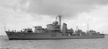 After completing trials and workups, Tobruk was deployed to the Korean War in August 1951.[1] Between October 1951 and January 1952, the destroyer carried out six patrols, primarily serving as an aircraft carrier escort, or performing shore bombardments.[1] Tobruk returned to Australia in February 1952.[1] In October, she was part of the security patrol around the Montebello Islands during Operation Hurricane, the first British nuclear weapons test.[1] In June 1953, Tobruk returned to Korea for a second deployment.[1] Although a ceasefire was signed in July 1953, Tobruk remained in the area until January 1954, then returned to Australia for a refit.[1] Tobruk received the battle honour "Korea 1951–53" for these deployments.[2][3]