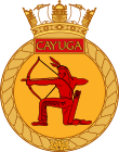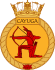 The Ship's badge is blazoned Or, an Indian of the Cayuga tribe, facing dexter, in kneeling posture, right knee on the ground, left leg bent and forward, two feathers in hair, lower part of body clad, upper bare, a quiver of arrows pendant from the left shoulder, the base resting on ground beside the right knee, the Indian holding a bow and arrow in the "ready" position all gules. When used to represent HMCS Cayuga, the name plate is in the livery colours, i.e. red with gold lettering, but when used to represent the RCSCC, it uses a gold nameplate with black lettering. The naval version has gold maple leaves at the base, but the cadet version has red leaves.