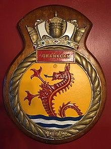 The submarine, built at Chatham Dockyard in England, was laid down on 25 March 1965, and launched on 17 September 1966.[28] She was commissioned on 22 June 1968 at Chatham.[28][26] She was also the final submarine constructed at Chatham Dockyard.[29] The submarine was named after the Okanagan First Nations people, and was assigned the pennant number S 74.[28]