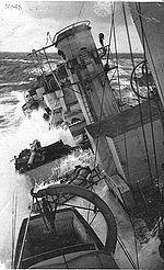 By October 1940, the ship's anti-aircraft armament was increased when the rear set of torpedo tubes was replaced by a 3-inch (76.2 mm) (12-pounder) AA gun.[6] The 'Y' gun was later removed to compensate for the additional depth charges added.[7] When Boadicea was converted into an escort destroyer at the end of 1943, her 'A' gun was replaced by a Hedgehog anti-submarine spigot mortar and additional depth charge stowage replaced the 12-pounder high-angle gun.[4] In addition, two QF 6-pounder Hotchkiss guns were added to deal with surfaced submarines at close range[8] and the 2-pounder guns were replaced by 20-millimetre (0.8 in) Oerlikon autocannon and four additional Oerlikon guns were also added.[4]