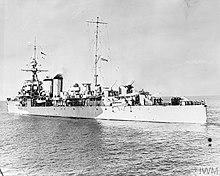 During World War II, the ship was initially attached to the 7th Cruiser Squadron of the Northern Patrol, in the Shetland area.[9] In November 1939, she took part in pursuit of the German cruiser Admiral Graf Spee. In February 1940, HMS Dragon crossed the Mediterranean and returned to the Atlantic. On 16 September 1940 she scored her first victory after capturing the French steamer Touareg.[10] On 23 September of the same year she reached the area of the port of Dakar, where she took part in Operation Menace against the French fleet stationed there. Together with HMS Inglefield and Foresight, she sank the Vichy France submarine Persée and took part in shelling the port. HMS Dragon moved to Freetown, from where she operated against the German cruiser Admiral Scheer in December.