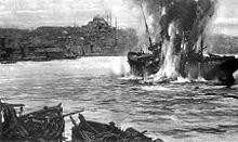 E11 was on her second tour when, on 6 August, she successfully torpedoed the Turkish torpedo cruiser Peyk-i Şevket, causing serious damage.[8] Two days later 8 August 1915 as a new British landing was underway at Suvla, E11 torpedoed the antiquated Turkish pre-dreadnought battleship Barbaros Hayreddin off Bulair at the northern entrance to the Dardanelles. The ship sank with the loss of 21 officers and 237 men.[9] Barbaros Hayreddin was one of two Ottoman battleships sunk during the campaign. Visiting Constantinople again, E11 sank a Black Sea collier Isfahan as it was preparing to unload — a significant blow as coal was the main fuel source and supplies were scarce. Moving into the Gulf of Izmit, on the night of 20 August, E11's first officer, Lieutenant Guy D'Oyly-Hughes, swam ashore and blew up a section of the Constantinople–Baghdad railway line, a feat for which he was awarded the Distinguished Service Cross (United Kingdom). Navigating Officer Lieutenant Robert Brown was also awarded the Distinguished Service Cross (United Kingdom). A reservist from the Merchant Navy, Brown had famously been born rounding the Cape Horn on the clipper John Gambles, the sister ship to the more famous Cutty Sark.