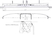 She was designed by Sir Edward Reed, and was in all significant factors an enlarged version of his earlier creation HMS Bellerophon with thicker armour and heavier guns. She had a pointed ram where previous ships had sported a rounded one; she was built with a forecastle, but had no poop until fitted with one as preparation for her role as Flagship, Mediterranean Fleet. She carried a balanced rudder, which reduced the physical effort of turning the wheel. Steam-powered steering was installed in 1874.