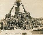 Most of the German 105-millimetre (4.1 in) shells failed to damage the British ship, but one did burst inside a gun position, killing or wounding most of its crew, and another burst inside the wireless compartment and knocked out her radio transmitter. The British shells battered Nürnburg severely; she was dead in the water by 18:25 with only two guns able to fire. Ten minutes later not a gun could shoot and the cruiser was aflame. She did not strike her colours until 18:57 and then lowered a boat filled with some of her wounded men. It promptly sank and Kent had to repair the splinter holes in her own boats before they could be launched. Nürnburg capsized half an hour later and Kent continued to search until 21:00, but only rescued a dozen men, five of whom later died.[17] She had been hit 38 times, but none of them penetrated her armour. One shell passed through the radio office without detonating and disabled Kent's transmitter. Another shell burst outside a midships casemate and ignited several bags of cordite. The flash fire travelled down the ammunition hoist, but quick action by a Royal Marine in the ammunition party in removing the cordite charge ready to be hoisted, closing the door to the magazine and promptly using a fire hose prevented a catastrophe. The ship suffered six crewmen were killed and eight seriously wounded during the battle; ten of these were in the casemate where the cordite ignited.[18] Kent was critically short of coal and had to steam slowly enough that she did not arrive at Port Stanley until the following afternoon.[19]