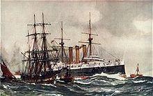 Kent, named to commemorate the English county,[8] was laid down at Portsmouth Royal Dockyard on 12 February 1900[9] and launched on 6 March 1901 (one day late due to weather), when she was christened by Lady Hotham, wife of Admiral Sir Charles Frederick Hotham, GCB, Commander-in-Chief, Portsmouth.[10] She was completed on 1 October 1903[1] and was initially placed in reserve.[11] On 15 March 1905 she ran aground in the Firth of Forth.[12] The ship was assigned to the China Station between 1906 and 1913 and returned to Portsmouth Dockyard for a refit in September 1913.[11]