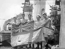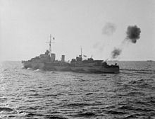 In January and February 1941 she was used to escort a number of minelaying operations in the North Sea. On 1 March she was one of the destroyers escorting the landing ships of Operation Claymore to the Lofoten Islands, and then provided support for the landing operations.[17] On 3 March she sank the German merchantman Bernhard Schulte at 61°55′N 5°07′E / 61.917°N 5.117°E.[18][19] Whilst carrying out this duty on 4 March, she intercepted the German trawler Krebbs and captured her with a boarding party. An Enigma machine and supporting documents were recovered and later transported to Bletchley Park to assist decryption efforts. In May Tartar was deployed to defend the Atlantic convoys. During these duties, she was present at the sinking of the German battleship Bismarck. After this, on 28 May Tartar was returning to Scapa Flow with Mashona, when they came under heavy air attack west of Ireland, and Tartar's action report states: "...It is believed that all attacking aircraft were H.E. 111's. Occasionally a F.W. Condor was seen shadowing astern. It is estimated that about 50 aircraft took part in the attacks over a period of 13 hours..."[20] The Mashona was hit and badly damaged, eventually capsizing, but in return Tartar shot down an He 111 bomber.[21] Tartar was able to rescue 14 officers and 215 ratings, and transported them to Greenock. During this engagement " Tartar used her Fuze Keeping Clock to aim her 4.7" guns and "...Every gun was used, the 4.7" in controlled fire and the 4" and close range weapons firing independently. 290 rounds of 4.7", 255 rounds of 4", 1,000 rounds of pom pom and 750 rounds of .5 machine gun ammunition were fired."[22]