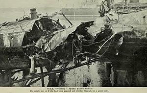 Viking was damaged after hitting a mine near the Colbart Bank on 29 January 1916.[20] Ten of Viking' s crew were killed.[21] On the night of 26/27 October 1916, German torpedo boats of their Flanders Flotilla carried out a large scale raid into the English Channel, hoping to attack the drifters watching the anti-submarine nets of the Dover Barrage, and to sink Allied shipping in the Channel. Viking was one of six Tribal-class destroyers waiting at readiness in Dover harbour, and when the Germans attacked the drifters and sank the supporting destroyer HMS Flirt, they were ordered to intervene. The destroyers split up as they left Dover harbour, with Viking leading Mohawk and Tartar from the Western entrance to the port, while the other three destroyers (Nubian, Amazon and Cossack) left by the other entrance and failed to join up with Viking's group. The group led by Viking encountered a group of unknown warships. When Viking challenged the ships (which were in fact the German 18th Half Flotilla), the German ships replied with shellfire that hit Mohawk and caused her steering to jam. This caused Mohawk to block the course of Viking when she attempted to pursue the German torpedo boats, allowing them to escape unharmed. Nubian and Amazon separately ran into a second German formation, the 17th Half Flotilla, with Nubian first being badly damaged by a torpedo and Amazon then heavily hit by German shells.[22]