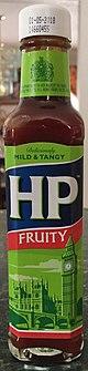 HP Sauce is a brown sauce[1] originally produced by HP Foods in the United Kingdom, now produced by the H. J. Heinz Company in the Netherlands. It was named after London's Houses of Parliament. Since its first appearance on British dinner tables in the late 19th century, HP Sauce has become an icon of British culture.[2] It was the best-selling brand of brown sauce in the UK in 2005, with 73.8% of the retail market.[3]