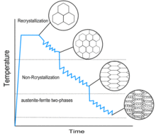 Controlled rolling is a method of refining grains of steel by introducing large amount of nucleation sites for ferrite in austenite matrix by rolling with temperature control, therefore increasing the strength of steel. There are three main stages during controlled rolling:[13]