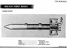 Some surviving HVAR rockets were converted to training targets for pilots to practice firing AIM-9 Sidewinder infrared-guided missiles. Known as the TDU-11/B to the US Air Force and Target Rocket Mark 26 Mod 0[9] to the US Navy, it was heavier than the base rocket at about 215lb. The target rocket used a Mk.6 head with inert lead ballast and was fitted with four Mark 21 (aluminum construction) or 33 (steel) tracking flares, 10 inches long by 1 inch wide and carrying 100 grams of pyrotechnic mixture, to provide a strong IR signature for the Sidewinder to lock onto. Carried paired with AIM-9s on AERO-3B launchers, a pilot would fire the rocket, then switch to his Sidewinder, wait for it to acquire the tracking flares, and fire. Target rockets were phased out by the USN in the mid-1960s in favor of towed or drone targets,[10] while the USAF and RAAF used the device into the 1980s[11][12]