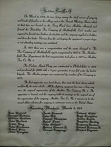 Haddonfield is home to the second oldest volunteer fire company in continuous service in the United States. Haddon Fire Company No. 1 was established as Friendship Fire Company on March 8, 1764, by 26 townsmen. Each member was to furnish two leather buckets while the company supplied six ladders and three fire hooks.[31]