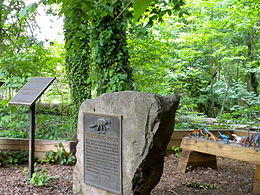 Haddonfield is a significant historic paleontology site. In 1838, William Estaugh Hopkins uncovered large bones in a marl pit in which he was digging. Hopkins displayed the bones at his home, Birdwood; and these bones sparked the interest of a visitor, William Foulke. In 1858, Foulke dug from the marl pit the first relatively complete skeleton of a dinosaur found in North America, Hadrosaurus foulkii. The skeleton was assembled in 1868 and is still displayed at Philadelphia Academy of Natural Sciences.[28] A 12-foot (3.7 m) replica of "Haddy" stands in the center of town.[24] Hadrosaurus was recognized officially as the state dinosaur of New Jersey in June 1991.[29]