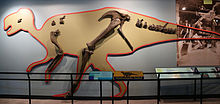 As in most hadrosaurs, the forelimbs were not as heavily built as the hindlimbs, but were long enough to be used in standing or movement.[1][5][3] The holotype specimen was a relatively large animal at the time of death with a 1.05 m (105 cm) long femur and 93.3 cm (933 mm) long tibia. Most of the preserved elements feature a marked robust composition with the fibula being one of the most robust among hadrosaurs.[1]