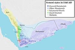Further north, Hafizi Isma'ilism was also adopted by some of the Hamdanids of Sana'a.[37] Himas ibn al-Qubayb and his son Hatim werethe first Hamdanid rulers to declare for the Hafiziyya.[38] After Hatim ibn Himas' death in 1138, the dynasty collapsed in internal feuds, but was reunited by Hatim ibn Ahmad ibn Imran and his son Ali. Both engaged in warfare with the Zaydi imamate of Saada, while Ali also attacked the Tayyibis under Hatim ibn Ibrahim al-Hamidi in 1166–1169, pushing them out from Shibam Kawkaban into Haraz.[39] In 1173, Ali assisted the Zurayids in defeating the Kharijite ruler of Zabid, Abd al-Nabi.[40] Soon after his return, he confronted the Ayyubid invasion of Yemen. He lost Sana'a in 1174, but soon recovered it and held it until 1189. Ali and his brothers continued to contest control over the northern part of the country around Sana'a until the early 13th century.[41]