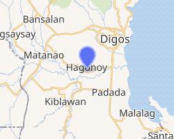 The municipality of Hagonoy has a total land area of 114.28 square kilometers representing about three (3%) percent of the total land area of the province of Davao del Sur. Located on the north-eastern coastal end of the Padada Valley, Hagonoy lies on the belly of the seahorse-like shaped province. It is bounded on the north by Digos City, the provincial capital, Davao Gulf on the east, the municipality of Matanao on the west, the municipality of Kiblawan on the south-west and the municipality of Padada on the south. The seat of municipal government is located in Poblacion about 8 kilometers away from Digos City.