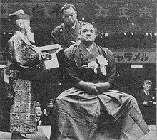 Haguroyama Masaji (Japanese: 羽黒山 政司, November 18, 1914 – October 14, 1969) was a Japanese professional sumo wrestler from Nakanokuchi, Niigata. He was the sport's 36th yokozuna.[1] He was a yokozuna for a period of twelve years and three months dating from his promotion to that rank in May 1941 until his retirement in September 1953,[1] which was an all-time record until surpassed in 2019 by Hakuhō. During his career Haguroyama won seven top division championships and was runner-up on six other occasions. However, he was always in the shadow of yokozuna Futabayama, who came from the same stable.[2] After his retirement he was the head coach of Tatsunami stable until his death in 1969.
