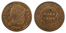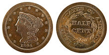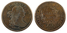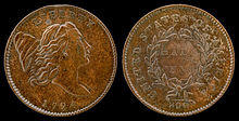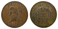 First authorized by the Coinage Act of 1792 on April 2, 1792,[1] the coin was produced in the United States from 1793 to 1857. The half-cent piece was made of 100% copper and was valued at five milles, or one two-hundredth of a dollar. It was slightly smaller than a modern U.S. quarter with diameters 22 mm (1793), 23.5 mm (1794–1836) and 23 mm (1840–1857).[2] Coinage was discontinued by the Coinage Act of February 21, 1857. They were all produced at the Philadelphia Mint.