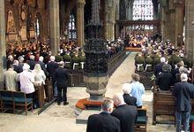 Former regimental colours of the 'Duke's' are laid up in the Halifax Minster. These include the stand used by the 33rd Regiment between 1761 and 1771, which is one of the oldest in existence in England, plus those carried by the regiment during the Battle of Waterloo and the Crimea.[22] The 1981 stand of colours, was taken out of service in 2002. They were marched through the town from the town hall to the minster, which at that time was still a parish church, accompanied by two escorts of 40 troops, the Regimental Drums and the Heavy Cavalry and Cambrai Band on Sunday 31 March 2007. The troops were then inspected by the Lord Lieutenant of West Yorkshire, Dr Ingrid Roscoe BA, PhD, FSA and the Mayor of Halifax Cllr Colin Stout making a total of eight stands of colours within the Regimental Chapel. The regiment was presented with the "Freedom of Halifax" on 18 June 1945.