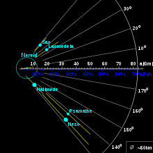 Halimede has the second most eccentric and third most inclined orbit around Neptune.[8] This is illustrated on the diagram in relation to other irregular satellites of Neptune. The satellites above the horizontal axis are prograde, the satellites beneath it are retrograde. The yellow segments extend from the pericentre to the apocentre, showing the eccentricity. It is also worth mentioning that Sao and Laomedeia are similar to Halimede but they both have prograde orbits unlike Halimede which has a retrograde orbit.[9]