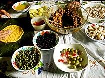 Hallaca filling is more elaborate than the standard tamale filling.[8] Ingredients differ from region to region and from family to family but may include a combination of beef, pork, bacon, lard, onion, sweet pepper, red pepper, scallion, garlic, salt, pepper, oregano, cumin and some type of cooking wine or vinegar. In the version from the Venezuelan Andes hallacas are made with guiso crudo which differ from other versions because the meat filling is not pre-cooked.[9] Some versions of the filling include leeks, Worcestershire sauce, mustard pickles, panela, or dark brown sugar.[10] The stew is simmered over low heat slowly for several hours.[7]