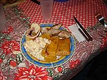 Hallaca is a Mesoamerican tamal-like dish that goes by various names and spread throughout the Spanish kingdoms in the Americas as far south as Argentina in the decades following the conquest. It is said to have been invented by slaves during the colonial era.[6] The slaves would prepare the Christmas Eve meal for the landowners and with leftover meat they made the hallacas filling for their own Christmas meal. One version of the dishes origin tale has it that the daughter of the landowning family asked to taste the hallacas. She and her family liked the dish so much they requested for it to be made for their dinner party and ever since it has been part of the traditional holiday meal for all economic classes.[7]