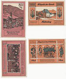 From 1917 until the 1920s Hallenberg, like many German towns, produced its own currency, known as Notgeld. During the First World War this was because the value of the official coinage exceeded its face value, so coins were hoarded or sold for their metal, and then from about 1923 the rate of hyperinflation meant that the central bank could not print and distribute the ever-higher banknote values quickly enough, so this was done locally.