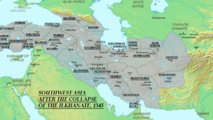 The work is also considered a substantial contribution to the ethno-national history of Iran.[8] Mustawfi notably uses the term "Iran" in his work.[9][10] Since the fall of the Iranian Sasanian Empire in 651, the idea of Iran or Iranzamin ("the land of Iran") as a political entity had disappeared. However, it did remain as an element of the national sentiment of the Iranians, and was occasionally mentioned in the works of other people.[9][8] With the advent of the Ilkhanate, the idea experienced a resurgence.[9] According to the modern historian Peter Jackson (2017), the reason behind this resurgence was the fall of the Abbasid Caliphate in 1258 and the "relative disenfranchisement of political Islam."[11] Mustawfi describes the borders of Iran extending from the Indus River to Khwarazm and Transoxiana in the east to Byzantium and Syria in the west, corresponding to the territory of the Sasanian Empire.[8][11] He defines the provinces of Iran in 20 chapters; Iraq ("Arab Iraq") or the "heart of Iranshahr", Persian Iraq, Arran, Mughan, Shirvan, Georgia, Byzantium, Armenia, Rabi'a, Kurdistan, Khuzestan, Fars, Shabankara, Kirman, Mukran, Hormuz, Nimruz, Khorasan, Mazandaran, Qumis, Tabaristan and Gilan.[8] This way of conceptualizing the history and geography of Iran has been emulated by other historians since the 13th-century.[8]