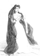 Her mad scene appeared to owe little to tradition and seemed almost like an improvisation, with several contemporary accounts remarking on her astonishing capacity for mime. Her performances produced an extraordinary reaction: men wept openly in the theater, and when they left were "convulsed by uncontrollable emotion."[3] The twenty-five-year-old Alexandre Dumas, père, who was about to embark on a major career as a novelist and dramatist, was in the audience and found the performance revelatory, "far surpassing all my expectations".[4] The French composer Hector Berlioz was also present at that opening night performance and later wrote: "The lightning flash of that sublime discovery opened before me at a stroke the whole heaven of art, illuminating it to its remotest depths. I recognized the meaning of dramatic grandeur, beauty, truth."[2] Even the wife of the English ambassador, Lady Granville, felt compelled to report that the Parisians "roar over Miss Smithson's Ophelia, and strange to say so did I".[5] (The actress's Irish accent and the lack of power in her voice had hindered her success in London.)[3] It wasn't long before new clothing and hair styles, à la mode d'Ophélie and modeled on those of the actress, became all the rage in Paris.[1]