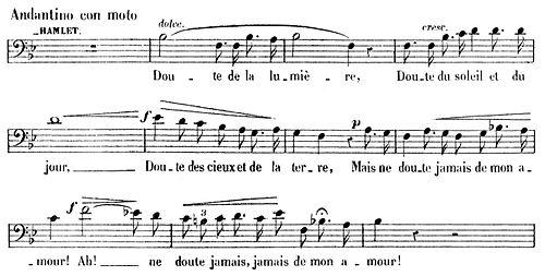 The duet affirms their love (Hamlet, Ophélie: Doute de la lumière – "Doubt that the light"). The text of the duet is based on Shakespeare's "Doubt thou the stars are fire", which is part of a letter from Hamlet to Ophelia which Polonius reads to Gertrude and Claudius. The melody of the vocal line in Hamlet's first phrases has been called the Theme of Hamlet's Love for Ophélie and appears several more times in the opera, with particular poignancy near the end of the Mad Scene (see below).[1]