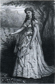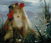 The composer Berlioz was soon totally infatuated with Miss Smithson. His love for her, initially unrequited, became an obsession and served as inspiration for his music. His Symphonie fantastique (Fantastic Symphony, 1830) portrays an opium-induced vision in which the musician's beloved appears as a recurrent musical motif, the idée fixe, which like any obsession "finds its way into every incredible situation [movement]".[6] The Fantastic Symphony's sequel Lélio, ou Le retour à la vie (Lélio, or the Return to Life, 1831) contained a song Le pêcheur ("The Fisherman"), a setting of Goethe's ballad Der Fischer, the music of which included a quotation of the idée fixe that is associated with a siren who draws the hero to a watery grave.[7] His Tristia, Op. 18, written in the 1830s although not published until 1852, included "La mort d'Ophélie" ("The death of Ophelia"), a setting of a ballade by Ernest Legouvé, the text of which is a free adaptation of Gertrude's monologue in act 4, scene 7. Berlioz married Smithson in 1833, although their relationship ultimately fell apart.[1][8][9]