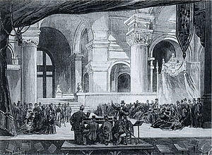 The work was premiered at the Paris Opéra (Salle Le Peletier) on 9 March 1868. Among the noted singers in the original cast were Jean-Baptiste Faure as Hamlet and Christine Nilsson as Ophelia.[28] The opera was staged, sung in Italian, at the Royal Italian Opera, Covent Garden (later the Royal Opera House, Covent Garden) in June 1869, with Nilsson as Ophelia and Charles Santley as Hamlet.[29] Hamlet was Thomas's greatest success, along with Mignon, and was further staged in Leipzig, Budapest, Brussels, Prague, New York City, Saint Petersburg, Berlin, and Vienna within five years of the Paris premiere.