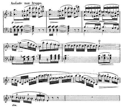 Ophélie's Theme from act 1 (first 4 bars). The example ends with a 3-bar flute cadenza which foreshadows her florid music later in the opera. (Piano-vocal score, pp. 26–27) |