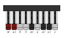 The labeling of the drawbar derives from the stop system in pipe organs, in which the physical length of the pipe corresponds to the pitch produced. Most Hammonds contain nine drawbars per manual. The drawbar marked "8′" generates the fundamental of the note being played, the drawbar marked "16′" is an octave below, and the drawbars marked "4′", "2′" and "1′" are one, two and three octaves above, respectively. The other drawbars generate various other harmonics and subharmonics of the note.[19] While each individual drawbar generates a relatively pure sound similar to a flute or electronic oscillator, more complex sounds can be created by mixing the drawbars in varying amounts.[20]