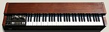 Most Hammond organs have two 61-note (five-octave) keyboards called manuals. As with pipe organ keyboards, the two manuals are positioned on two levels close to each other. Each is laid out in a similar manner to a piano keyboard, except that pressing a key on a Hammond results in the sound continuously playing until it is released, whereas with a piano, the note's volume decays. No difference in volume occurs regardless of how heavily or lightly the key is pressed (unlike with a piano), so overall volume is controlled by a pedal (also known as a "swell" or "expression" pedal).[10] The keys on each manual have a lightweight action, which allows players to perform rapid passages more easily than on a piano. In contrast to piano and pipe organ keys, Hammond keys have a flat-front profile, commonly referred to as "waterfall" style. Early Hammond console models had sharp edges, but starting with the B-2, these were rounded, as they were cheaper to manufacture.[11] The M series of spinets also had waterfall keys (which has subsequently made them ideal for spares on B-3s and C-3s[12]), but later spinet models had "diving board" style keys which resembled those found on a church organ.[13] Modern Hammond-Suzuki models use waterfall keys.[14]