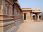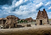 The Vitthala temple and market complex is over 3 kilometres (1.9 mi) north-east of the Virupaksha temple near the banks of the Tungabhadra River. It is the most artistically sophisticated Hindu temple in Hampi, and is part of the sacred centre of Vijayanagara. It is unclear when the temple complex was built, and who built it; most scholars date it to a period of construction in the early-to-mid-16th century.[79] Some of the books mention that its construction began during the time of Devaraya II and continued during the reign of Krishnadevaraya, Achuytaraya, and probably Sadasivaraya and it stopped probably due to the destruction of the city in 1565.[33] The inscriptions include male and female names, suggesting that the complex was built by multiple sponsors. The temple was dedicated to Vitthala, a form of Krishna also called Vithoba.[79] The temple opens to the east, has a square plan and features an entrance gopuram with two side gopurams. The main temple stands in the middle of a paved courtyard and several subsidiary shrines, all aligned to the east.[79] The temple is a unified structure in a courtyard measuring 500 by 300 feet which is surrounded by a triple row of pillars. It is a low structure of one storey with an average height of 25 height. The temple has three distinct compartments: a garbhagriha, an ardhamandapa and a mahamandapa (or sabha mandapa).[33]