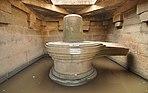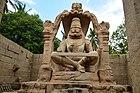 South of the Krishna temple's exterior are two adjacent shrines, one containing the largest monolithic Shiva Linga and the other with the largest monolithic Yoga-Narasimha avatar of Vishnu in Hampi.[70] The 3 metres (9.8 ft) Shiva Linga stands in water in a cubical chamber and has three eyes sketched on its top. South of this is the shrine for a 6.7 metres (22 ft)-high Narasimha—the man-lion avatar of Vishnu—seated in a yoga position. The Narasimha monolith originally had goddess Lakshmi with him, but it shows signs of extensive damage and a carbon-stained floor—evidence of attempts to burn the shrine down. The statue has been cleaned and parts of the shrine have been restored.[70]