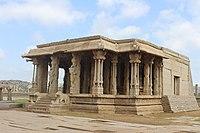 The Vitthala temple has a Garuda shrine in the form of a stone chariot in the courtyard; it is an often-pictured symbol of Hampi. Above the chariot is a tower, which was removed during 1940s, as per historian Dr.S.Shettar.[80] In the front of the stone chariot is a large, square, open-pillared, axial sabha mandapa, or community hall.[79] The mandapa has four sections, two of which are aligned with the temple sanctum. The mandapa has 56 carved stone beams of different diameters, shape, length and surface finish that produces musical sounds when struck; according to local traditional belief, this hall was used for public celebrations of music and dancing.[81][82] It is classified as Karakkoil, a temple fashioned after temple chariots which are taken in procession around the temple during festivals.[83]