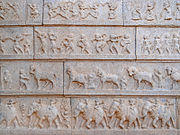 The Hazara Rama temple, referred to as the Ramachandra temple in inscriptions, occupied the western part of the urban core in the royal centre section of Hampi. This temple was dedicated to Rama of the Ramayana fame, and an avatar of Vishnu. It was the ceremonial temple for the royal family. The temple is dated to the early 15th century and is attributed to Devaraya I.[92] The temple's outer walls portray the Hindu Mahanavami (Dasara) and the spring Holi festival procession and celebrations in parallel bands of artwork.[92] The lowest band shows marching elephants, above it are horses led by horsemen, then soldiers celebrated by the public, then dancers and musicians, with a top layer depicting a boisterous procession of the general public. The depiction mirrors the description of festivals and processions in surviving memoirs of Persians and Portuguese who visited the Vijayanagara capital.[93][94]