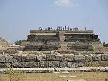 The Mahanavami platform, also called the "Great Platform", "Audience Hall", "Dasara" or "Mahanavami Dibba" monument, is within a 7.5-hectare (19-acre) enclosure at one of the highest points inside the royal centre (urban core). It has ceremonial structures.[101][102] It is mentioned in the memoirs of foreigners who visited Vijayanagara, some calling it the "House of Victory".[103] The largest monument in this complex has three ascending square stages leading to a large, square platform that likely had a wooden mandapa above it. This was burnt down during the destruction of Hampi.[104]