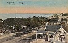 Hampton, like Brighton, started off as a place of market gardens in the 1840s and 1850s, supplying fruits and vegetables for Melbourne. In the 1850s, interest started to grow in the beaches in the area as places for daytrips and holidays for Melbournians, particularly Picnic Point, on the beautiful bay foreshore of Hampton. This expanded when a railway line was built to Brighton Beach in the 1860s. In 1887, the railway line was extended to Sandringham, with a station servicing Picnic Point. It was called Retreat, after the Retreat Hotel at the Point. However, several landmarks in the area, including the beach, had been named Hampton, after a local market gardener Dyas Hampton, and as wealthy landowners began buying subdivided land in the area, they favored the name Hampton as it sounded more regal. The name was set when the station was renamed Hampton. Hampton Post Office opened on 1 July 1909.[3]