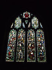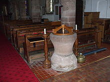 The parish church of St. Mary and St. Bartholomew has a chancel, nave with narrow aisles, west tower, south porch, and north vestry. The chancel is of about mid 12th-century date. It is comparatively long and narrow for the period, in a church of this size, and it has an unusual north doorway near the west end; it is possible that it represented the complete church, at least for a short time. The nave, if not coeval, was built soon afterwards and had a late-12th-century south aisle, of which the arcade remains. Possibly the nave was of the same width as the chancel, but was widened to the north about 5 ft (1.5 m). about the middle of the 13th century and a narrow north aisle and arcade added. The chancel arch was widened at the same time to the utmost limits permitted by the width of the chancel. For some reason, probably weakness, the north aisle was rebuilt late in the 14th century on the old foundations of the narrow aisle. This was followed by a similar rebuilding of the south aisle early in the 15th century, again without widening it. About the same time the west tower was begun, but carried up only a short way, the completion being delayed until late in the century. The last medieval alteration was the building of the clerestory in the 16th century in place of the old steeply pitched roof indicated by the lines on the tower.[7] The tower bore a tall spire "till by the extraordinary violence of lightning and thunder happening on St.Andrew's Day, in the night, in the year 1643, it was cloven, and fell to the ground: at which time the whole fabrick, with the tower, were torn in divers places."[5] The south porch and north vestry are modern, and various repairs and restorations have been executed to other parts. The chancel was rebuilt in 1879 with the old material[7] overseen by the architect W. E. Nesfield.[1] All the roofs are modern.[7] The church bells and most of their fittings were transplanted here from Manchester in 1976, where they had previously hung in the church of St John in Miles Platting, then being demolished due to subsidence.[8]